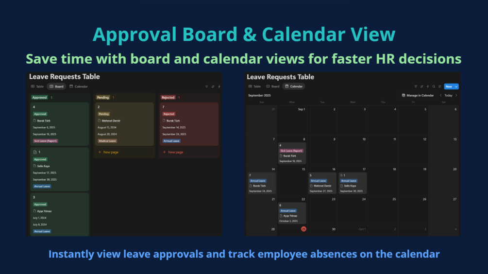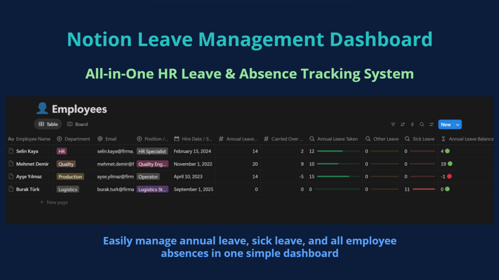 All-in-one Notion dashboard to manage HR leave, absences, and approvals with ease.
